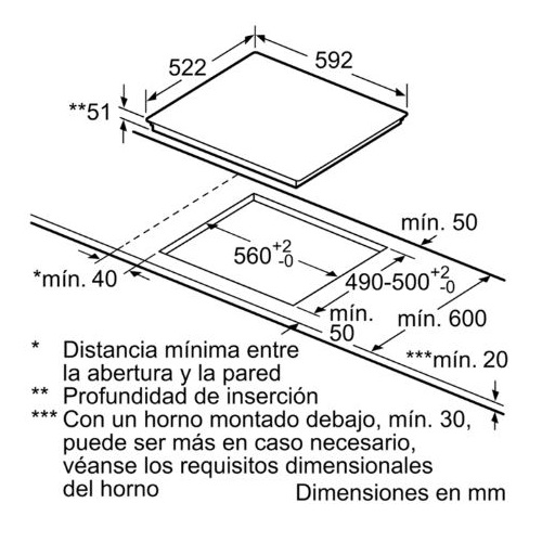 – Kích thước bếp (chiều cao, chiều rộng, chiều sâu): 51 x 592 x 522 mm